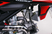 Ce système est appelé "Progressive Link" et avec une débattement de 9.8" de la roue arrière, la suspension réglable permettra aux pilotes de régler la suspension avec précision. Cadre acier inspire confiance et donne aux pilotes beaucoup d'aisance sur le pilotage tout en conservant la position du repose-pied vers l'arrière, ce qui permet une bien meilleure maniabilités.