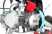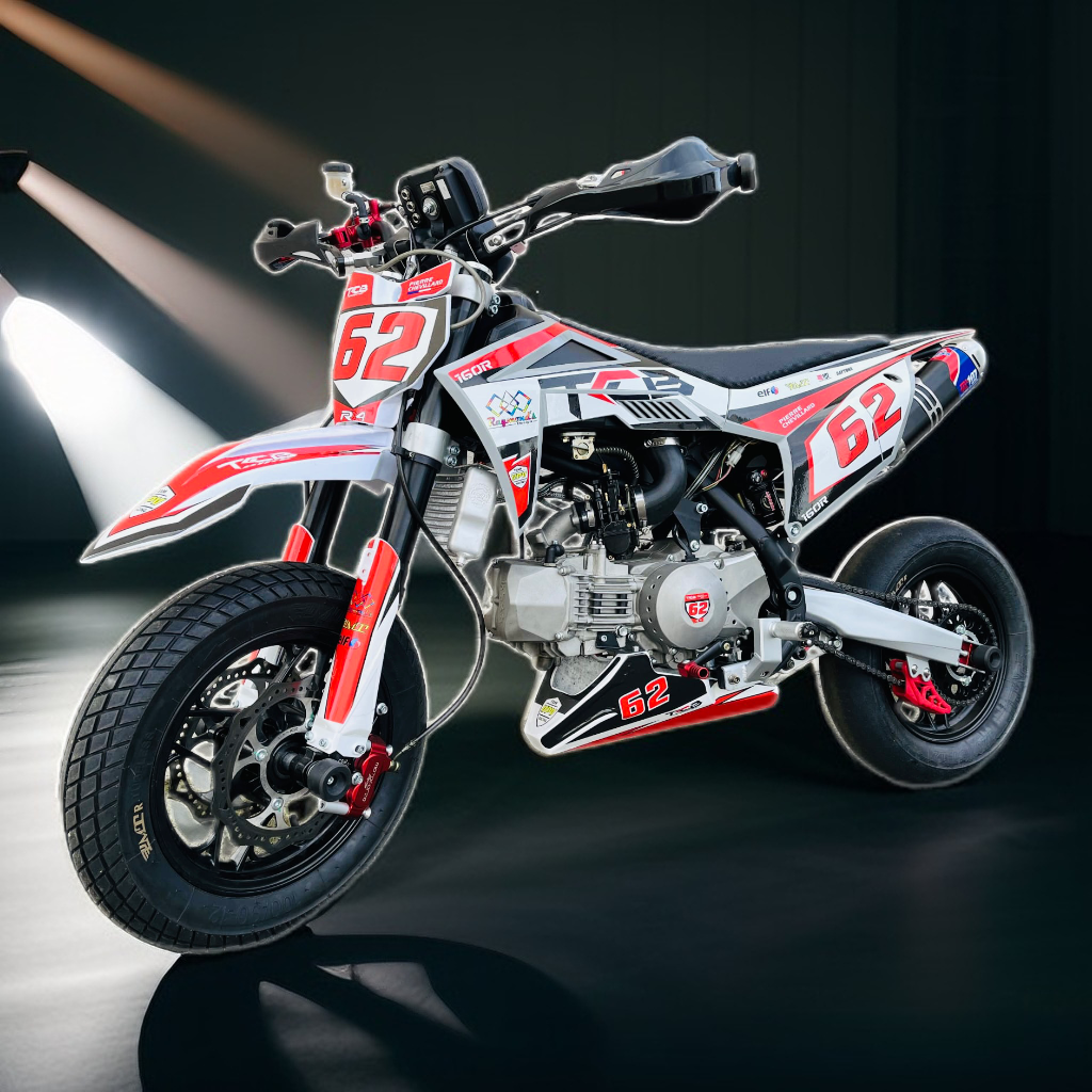 Le double disque à l'avant offre un freinage supérieur, ce qui est particulèrement important pour une moto de piste supermotard. Les tampons de protection d'axes protégeront la moto contre les rayures et les égratignures. Cette moto est également équipé d'un moteur 150YX ou 125YX type KLX.